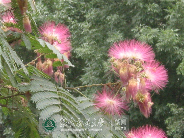 讀大學時,因為我是從青??歼^來的,又只讀了兩年的高中,高考成績全班倒數第一,入學后,深感和同學的差距。笨鳥先飛,我只有比別人多用功,多花時間,才能趕上同學的腳步。大一下學期六月的一天,因為快要期末考試了,我吃完午飯,就拿著書去木板房教室學習。中午的太陽明晃晃的掛在天上,知了的叫聲都變得懶洋洋了,教室里又悶又熱,我的學習效率不佳,于是,我拿著書走出了教室,循著樹蔭,邊走邊背,不知不覺就走到了生物樓門前的那條路。一陣微風吹來,眼前劃過一抹粉色,一朵淡粉色的小絨球飄落在了書上。仔細一看這個小絨球竟是那樣的柔軟,全身上下沒有一個花瓣,都是一些上粉下白的花絲,在熱氣中抖動著。仰頭望去慕然發現生物樓門前左右各有一棵傘狀的大樹,一片片羽狀的枝葉柔軟嫩綠,樹冠上開滿了粉紅的花簇,如在半空綠樹云中撐起一把把粉紅的小傘,既像鸚鵡頭上的羽冠,又好似搖動的羽毛扇。散垂的花絲如馬纓,點綴在郁郁蔥蔥的綠葉間,隨風搖曳;如裙紗,在舞女的陶醉中擺開,欲放又頷。低頭望去,滿地落纓,竟讓炙熱的水泥地,多了幾分清涼和柔美。小心的捻著細細的花莖,仿佛捻著滿懷思鄉之情,輕輕的夾在書里,看著枝頭兒的花蕊,閉了眼睛,深深地吸一口氣,一股淡雅而閑適的清香沁入心田,噢,思鄉的的感覺竟然也會這般清甜?忍不住去仰望,忍不住去想知道她的名字…
