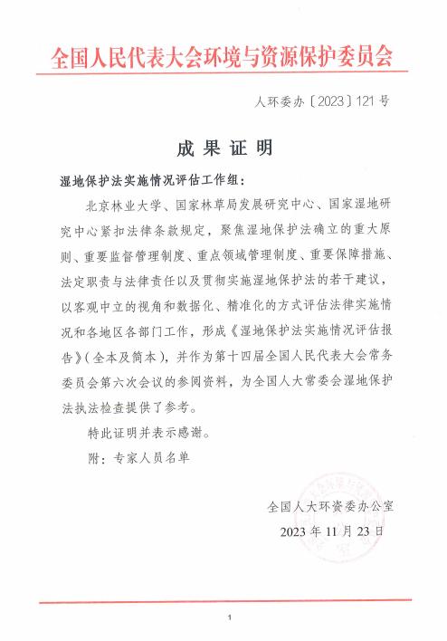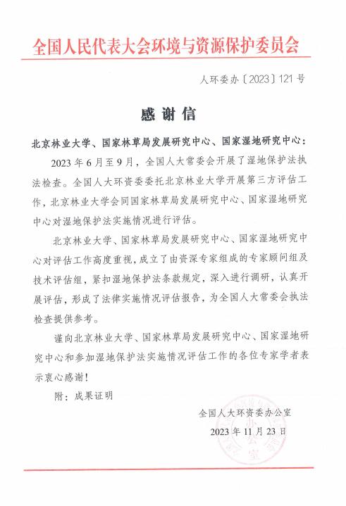 近日,我校收到全國人民代表大會環境與資源保護委員會發來的感謝信,信中對我校牽頭開展濕地保護法實施情況評估工作表示感謝,并附上了成果證明和專家人員名單。