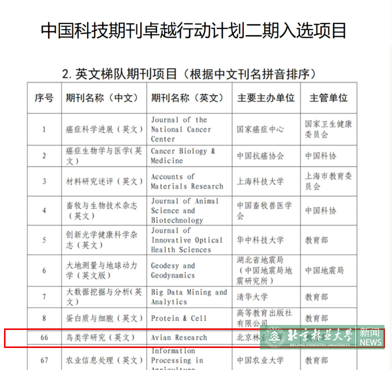 日前,中國科技期刊卓越行動計劃二期入選項目名單公布。我校主辦的《森林生態(tài)系統(tǒng)(英文)》(Forest Ecosystems)首次入選英文領(lǐng)軍期刊項目,《鳥類學(xué)研究(英文)》(Avian Research)入選英文梯隊期刊項目。這是我校在卓越行動計劃第一個建設(shè)周期中獲批兩項英文梯隊項目后取得的又一重大突破,進一步彰顯了我校在國家科技期刊建設(shè)中的學(xué)術(shù)實力和國際影響力。