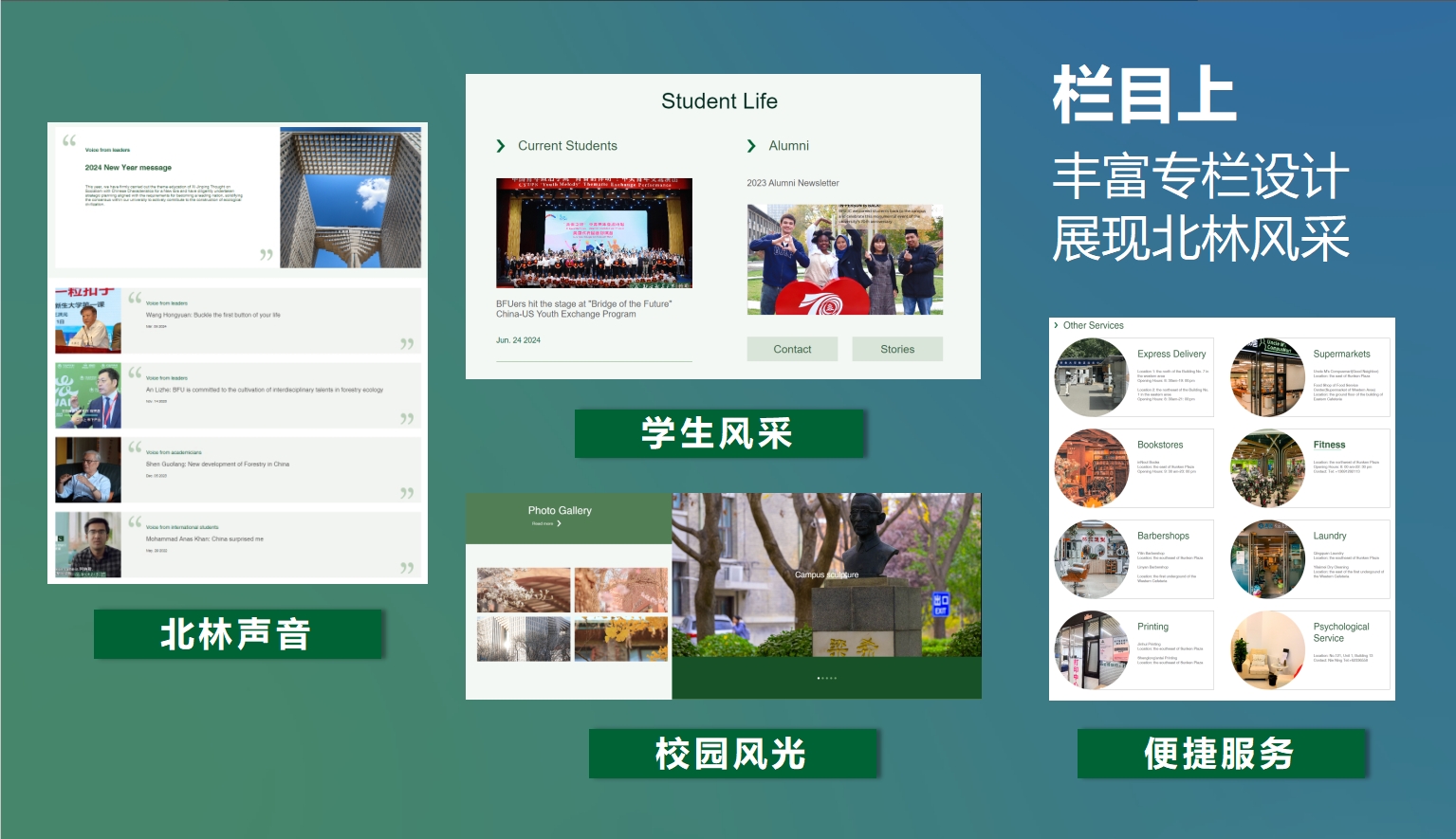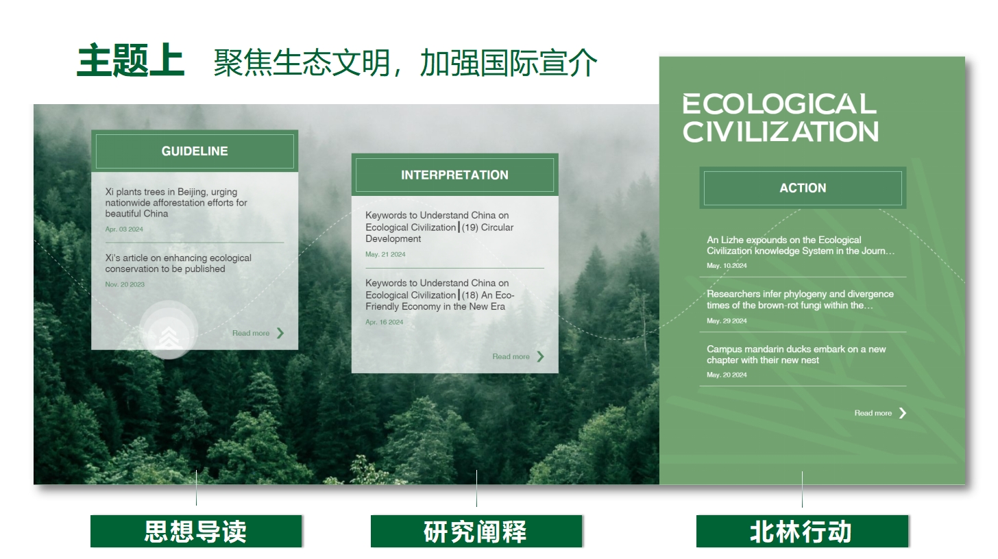 在學(xué)校黨委的高度重視、大力支持下,自去年9月起,我校啟動(dòng)新版英文網(wǎng)站升級(jí)改版工作,歷時(shí)一年精心開發(fā),通過開展大量國內(nèi)外高校網(wǎng)站調(diào)研,組織校內(nèi)留學(xué)生進(jìn)行用戶調(diào)研,面向相關(guān)部門征集意見與需求等,對(duì)網(wǎng)站設(shè)計(jì)、功能與內(nèi)容進(jìn)行全面升級(jí)。以全新形象正式向世界官宣的北京林業(yè)大學(xué)英文網(wǎng)站,將有助于加快習(xí)近平生態(tài)文明思想的國際傳播,進(jìn)一步提升我校國際知名度、社會(huì)美譽(yù)度和海外影響力。