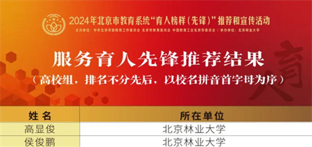 材料科學與技術學院曹金珍榮獲北京市教育系統“教書育人榜樣”稱號(系我校首次獲得),林學院黃華國、馬克思主義學院牟文鵬榮獲北京市教育系統“教書育人先鋒”稱號,黨委學生工作部阿巴斯·吐爾遜、環境科學與工程學院李凌榮獲北京市教育系統“管理育人先鋒”稱號,信息化建設與管理辦公室高顯俊、綜合保障部侯俊鵬榮獲北京市教育系統“服務育人先鋒”稱號。