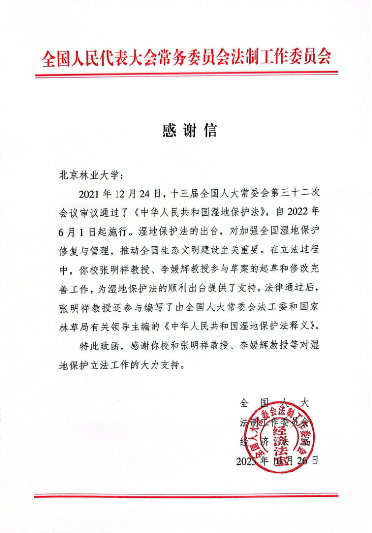 10月26日,全國人民代表大會常務委員會法制工作委員會專門向我校致感謝信,感謝北京林業(yè)大學對國家濕地保護立法工作的大力支持。