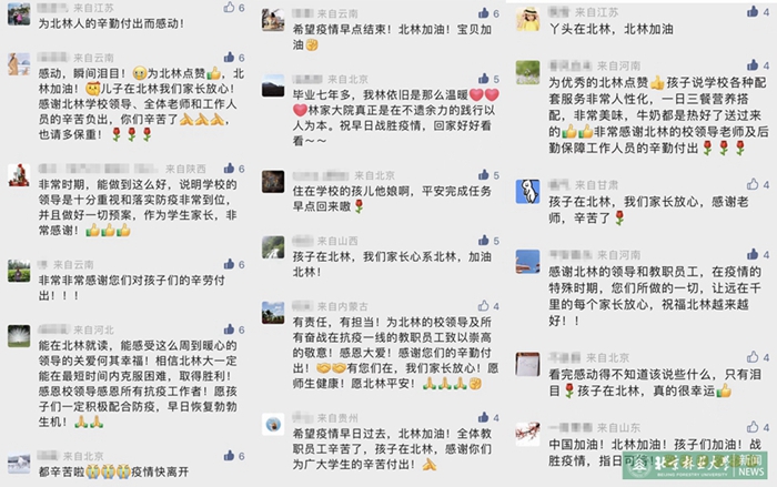 “同心協(xié)力、共克時艱,感謝北林在戰(zhàn)‘疫’時刻帶給孩子們家一樣的溫暖!”“看完推文非常感動,感謝北林領導、老師和工作人員的辛苦付出!孩子交給你們,我們家長放心,北林加油!”11月24日,我校官微發(fā)布推文《全力以赴守護師生身體健康和生命安全!》,在官微后臺,學生家長們留言200余條,紛紛為學校高效、科學、暖心的防疫舉措點贊,書寫了一份令人感動的家校情。