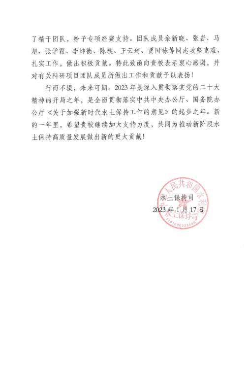 1月17日,水利部水土保持司向我校致感謝信,感謝我校長期以來對(duì)水土保持工作的大力支持,以及教師團(tuán)隊(duì)攻堅(jiān)克難、扎實(shí)工作為有關(guān)科研項(xiàng)目做出的積極貢獻(xiàn)。