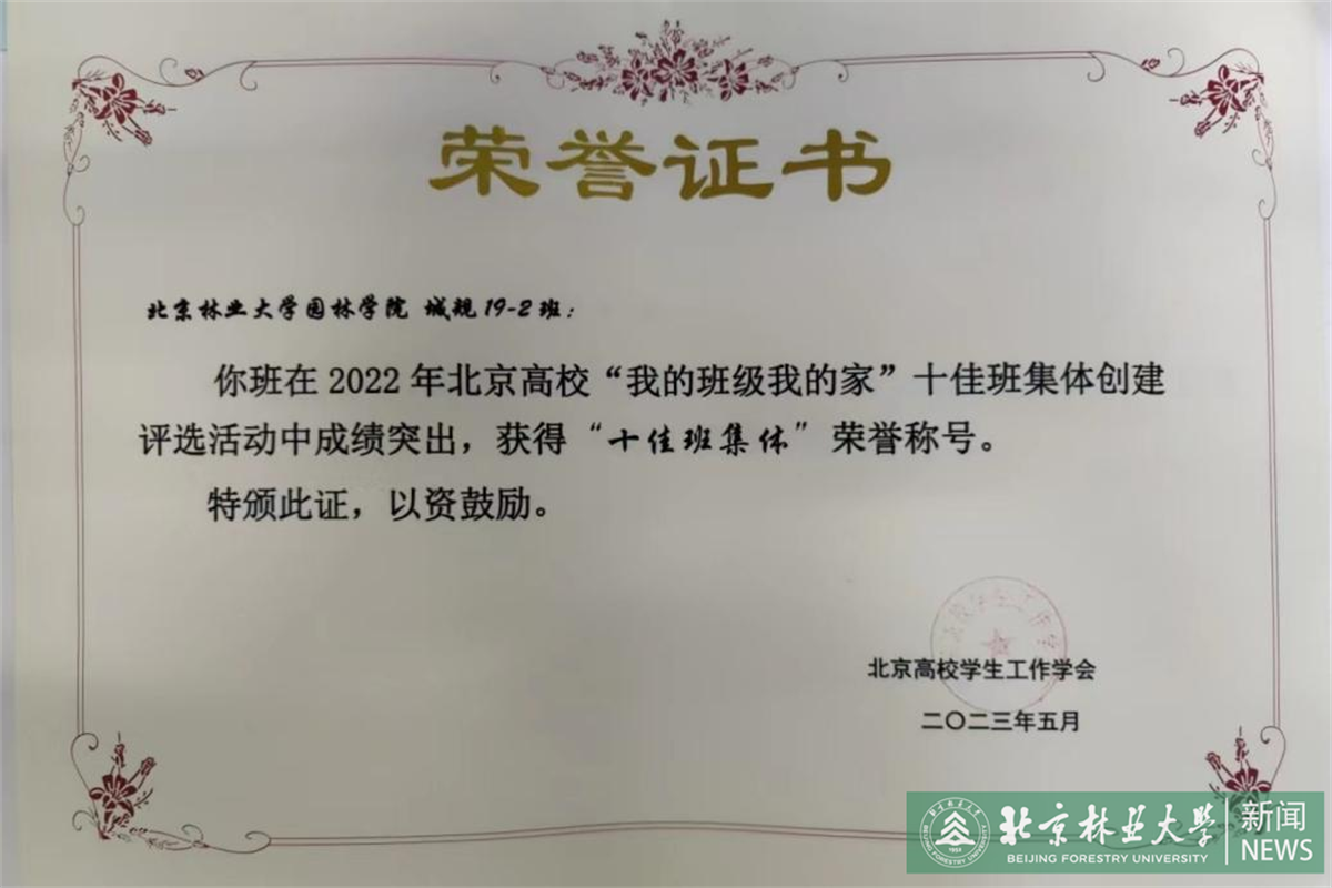 5月19日,2022年北京高校“我的班級我的家”十佳班集體創(chuàng)建評選活動在北京工業(yè)大學(xué)舉行,我校園林學(xué)院城鄉(xiāng)規(guī)劃192班從來自全市53所高校的200余個基層班級中脫穎而出,榮獲2022年北京高校“十佳班集體”榮譽稱號。