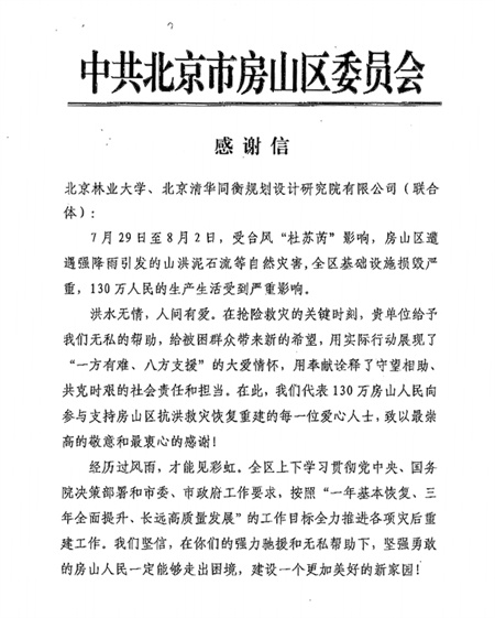 近日,我校收到中共北京市房山區委員會和北京市房山區人民政府發來的感謝信,信中對我校師生參與房山區災后重建工作表示感謝。