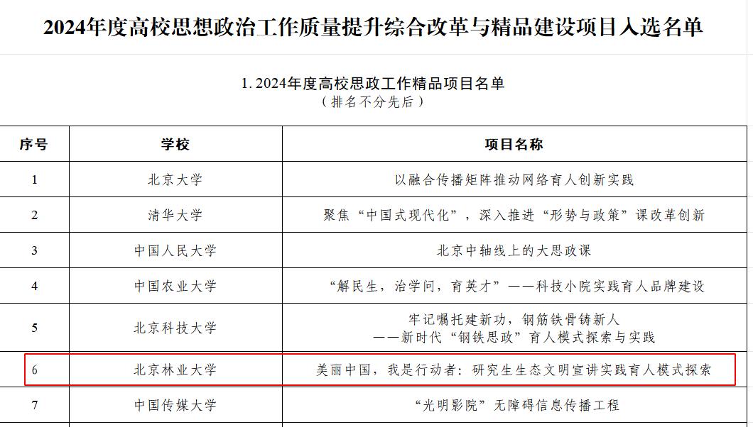 長期以來,我校聚焦服務“國之大者”,自覺主動把習近平生態文明思想融入校園思政文化精品項目建設,黨委宣傳部聯合各單位精心組織策劃,加大申報力度,取得了豐碩成果。下一步,我校將深入學習貫徹習近平文化思想,持續挖掘北林文化元素、文化成果,著力培育和打造更多校園原創思政文化精品項目,努力為學校事業高質量發展提供堅強思想保證和強大精神動力。