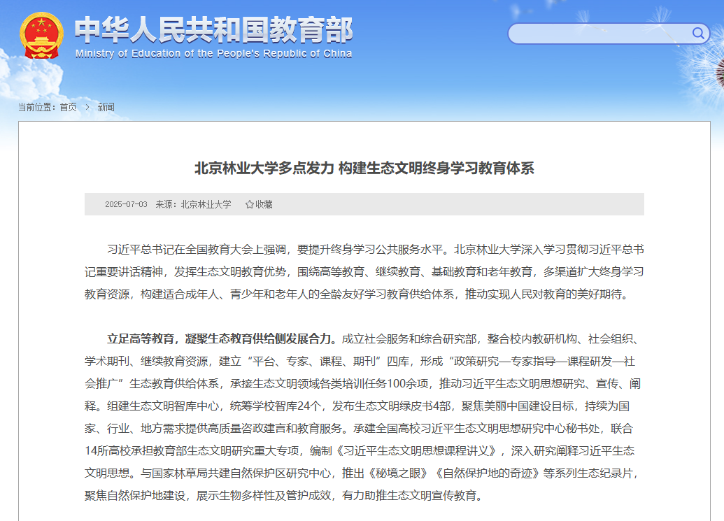 7月3日,教育部網站以《北京林業大學多點發力 構建生態文明終身學習教育體系》為題,對我校構建生態文明終身學習教育體系特色做法進行了報道。報道全文如下: