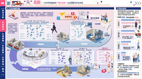 其中一等獎作品為“元”后街——北京學院路高校數字后街生成邏輯及時空特征,由學院錢云、畢波為指導教師,孟子一、韓逸雪、劉芳君、劉舒然等4名同學組成的團隊設計完成。作品選取北京學院路高校周邊“數字后街”為研究對象,通過訪談、問卷、觀察、數據爬取等方法收集一手資料,采用定性與定量結合的分析方法,探究封閉大院型校園如何在數字技術和社群經濟的發展驅動下形成虛擬與現實結合的數字后街,最終構建社會網絡并進行規律探討,提出問題,對“元后街”的未來進行展望。