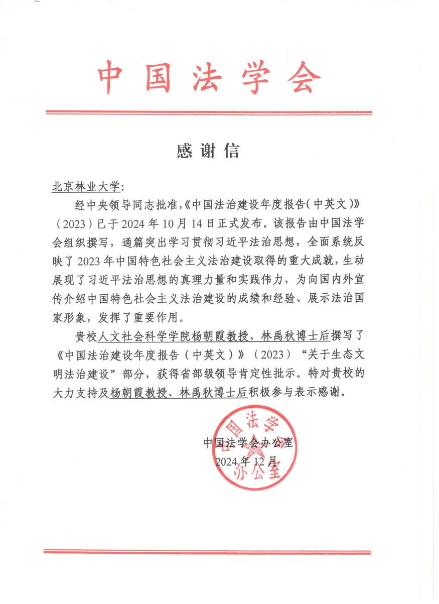 中國法學(xué)會向我校發(fā)來感謝信。信中指出,《中國法治建設(shè)年度報告(中英文)》(2023)已于2024年10月14日正式發(fā)布,對我校的大力支持及楊朝霞教授、林禹秋博士后積極參與“生態(tài)文明法治建設(shè)”部分的撰寫表示感謝。