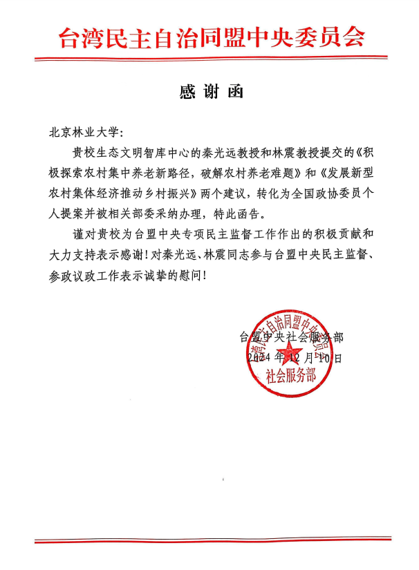 臺盟中央向我校發(fā)來感謝信,對我校智庫中心參與臺盟中央民主監(jiān)督、參政議政工作表示感謝。智庫研究員秦光遠(yuǎn)、林震向臺盟中央提交的《積極探索農(nóng)村集中養(yǎng)老新路徑,破解農(nóng)村養(yǎng)老難題》和《發(fā)展新型農(nóng)村集體經(jīng)濟(jì)推動鄉(xiāng)村振興》兩個建議,轉(zhuǎn)化為全國政協(xié)委員個人提案并被相關(guān)部委采納辦理。
