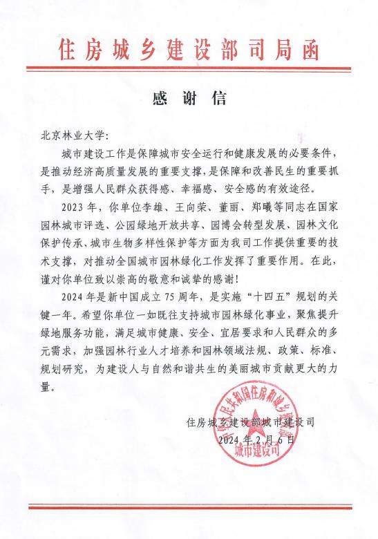 2024年2月6日,住房城鄉(xiāng)建設(shè)部城市建設(shè)司向我校發(fā)來感謝信。信中指出,我校李雄、王向榮、董麗、鄭曦等同志在國家園林城市評選、公園綠地開放共享、園博會轉(zhuǎn)型發(fā)展、園林文化保護(hù)傳承、城市生物多樣性保護(hù)等方面為住房城鄉(xiāng)建設(shè)部城市建設(shè)司工作提供重要的技術(shù)支撐,對推動全國城市園林綠化工作發(fā)揮了重要作用。