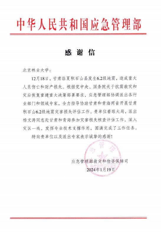 2024年1月19日,應(yīng)急管理部救災(zāi)和物資保障司向我校發(fā)來感謝信。信中指出,2023年12月18日,甘肅臨夏積石山縣發(fā)生6.2級地震,造成重大人員傷亡和財(cái)產(chǎn)損失。我校著眼大局,派出楊文濤同志赴甘肅和青海參加災(zāi)害損失核查評估工作,深入災(zāi)區(qū)一線,發(fā)揮專業(yè)技術(shù)支撐作用,圓滿完成了工作任務(wù)。