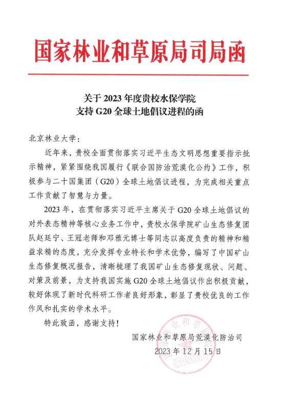 2023年12月15日,國家林業(yè)和草原局荒漠化防治司向我校發(fā)來感謝信。信中指出,我校積極參與二十國集團(tuán)(G20)全球土地倡議進(jìn)程,為完成相關(guān)重點(diǎn)工作貢獻(xiàn)了智慧與力量。水保學(xué)院礦山生態(tài)修復(fù)團(tuán)隊(duì)趙廷寧、王冠老師和鄧雅元博士等同志編寫的中國礦山生態(tài)修復(fù)概況報(bào)告,為支持我國實(shí)施G20全球土地倡議作出積極貢獻(xiàn),較好體現(xiàn)了新時(shí)代科研工作者良好形象,彰顯了我校優(yōu)良的工作作風(fēng)和扎實(shí)的學(xué)術(shù)水平。