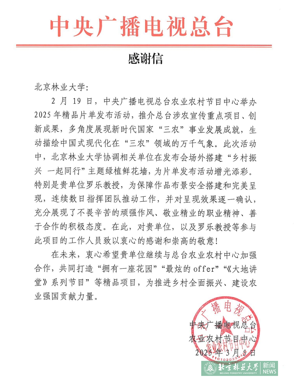 2025年3月5日,中央廣播電視總臺農(nóng)業(yè)農(nóng)村節(jié)目中心向我校發(fā)來感謝信。信中表示,在農(nóng)業(yè)農(nóng)村節(jié)目中心舉辦的2025年精品片單發(fā)布活動中,我校協(xié)調(diào)相關(guān)單位在發(fā)布會場外搭建“鄉(xiāng)村振興 一起同行”主題綠植鮮花墻,為片單發(fā)布活動增光添彩。信中同時對我校羅樂教授為保障作品布景安全搭建和完美呈現(xiàn)所付出的辛勤努力表示衷心感謝。