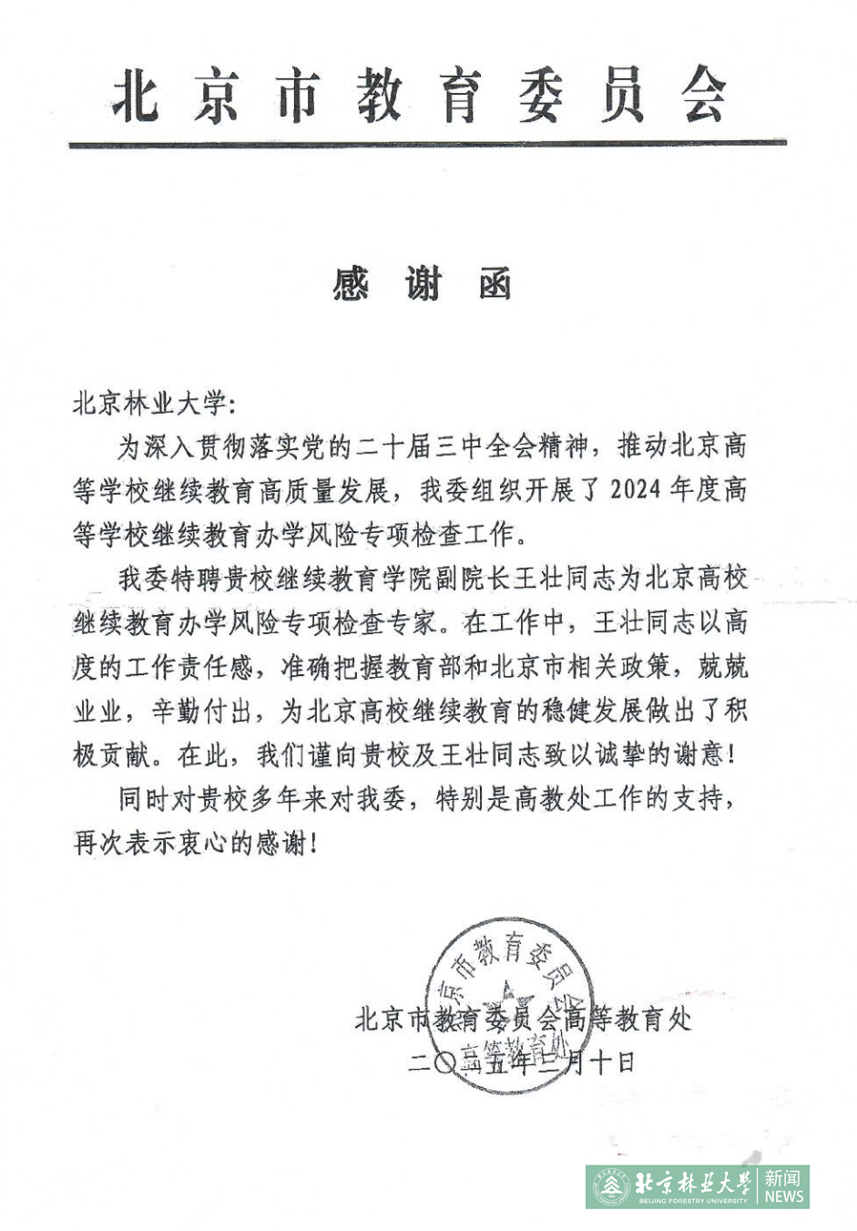 2025年3月10日,北京市教育委員會高等教育處向我校發(fā)來感謝信,感謝我校多年來對北京市教委,特別是高教處工作的支持。信中同時對我校繼續(xù)教育學(xué)院副院長王壯同志在受聘北京高校繼續(xù)教育辦學(xué)風(fēng)險專項(xiàng)檢查專家期間,為北京高校繼續(xù)教育的穩(wěn)健發(fā)展做出的積極貢獻(xiàn)致以誠摯謝意。