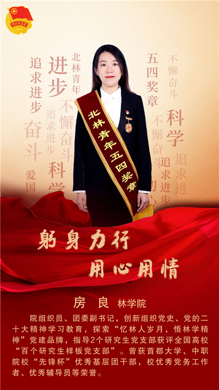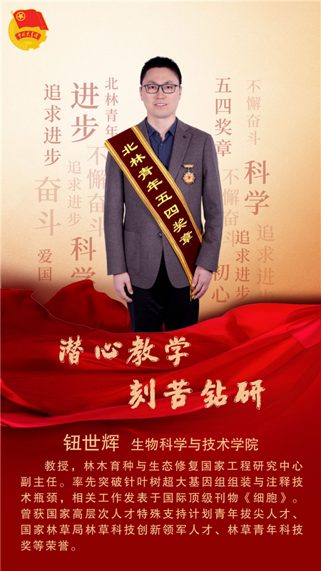 北林青年“五四獎章”是我校共青團最高榮譽。經過基層推薦、資格審查、材料評審、現場答辯等環節,鈕世輝、楊哲、房良、夏蕓楓、戴璐、甄恒、賈康寧、奐圣鑫、杜安娜、范志輝等十名師生獲評首屆北林青年“五四獎章”,以下是獲獎者簡介。