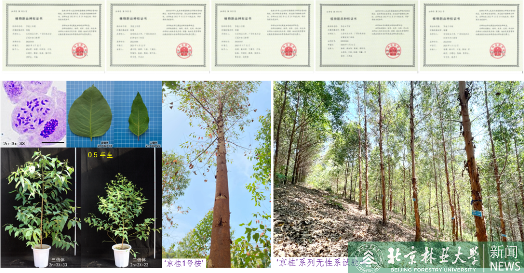 研究表明,林木三倍體具有速生、纖維長、木質素含量低等特性,在紙漿材等纖維用材新品種選育方面具有優勢。桉樹育種團隊通過十余年潛心研究,克服了桉樹生殖發育周期長、生物學基礎研究薄弱、樹體高大需高空作業等困難,攻克了桉樹配子染色體加倍系列技術難題,于世界上首次獲得了桉樹三倍體(2n=3x=33)新種質。在此基礎上選育出‘京桂1號桉’、‘京桂2號桉’、‘京桂3號桉’、‘京桂4號桉’、‘京桂5號桉’共5個桉樹三倍體新品種,并獲國家林業和草原局頒發的植物新品種保護權證書。獲得授權的‘京桂’系列桉樹三倍體新品種是尾葉桉(Eucalyptus urophylla)大孢子染色體加倍來源的半同胞雜種三倍體無性系,相較于二倍體對照,株高、地徑生長提高約1.3倍,葉面積增大1.8倍,光合速率高1.6倍,表現出顯著的營養生長優勢。生物科學與技術學院楊珺講師、康向陽教授,以及廣西壯族自治區國有東門林場邱炳發正高級工程師、蘭俊高級工程師、王建忠高級工程師等是新品種的主要培育人。