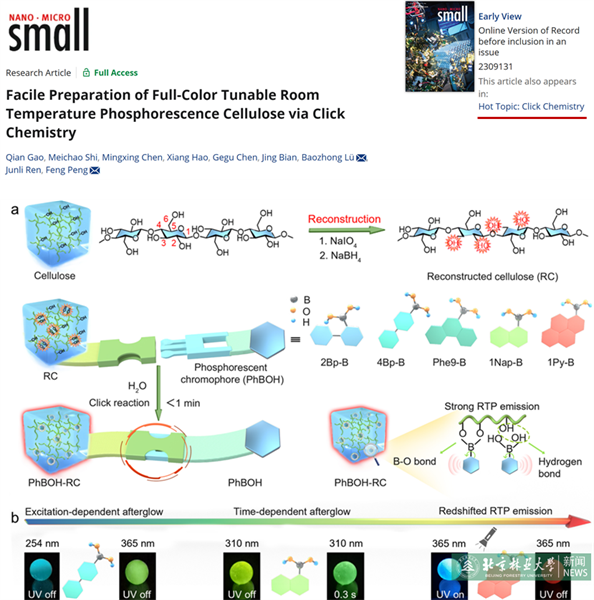 近日,材料科學與技術學院彭鋒教授課題組在纖維素基室溫磷光(RTP)材料研究領域取得新進展,研究論文以“Facile preparation of full-color tunable room temperature phosphorescence cellulose via click chemistry”為題發表于材料領域一區Top期刊《Small》(IF="13.3),并入選《Angew. Chem. Int. Ed.》最新一期的點擊化學熱點話題文章(Hot Topic: Click Chemistry)。