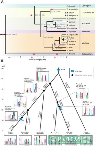 (A) 沙冬青與部分豆科植物的系統(tǒng)發(fā)生樹,以及物種分化時間的推斷;(B) 沙冬青與其他豆科植物的祖先染色體分析。