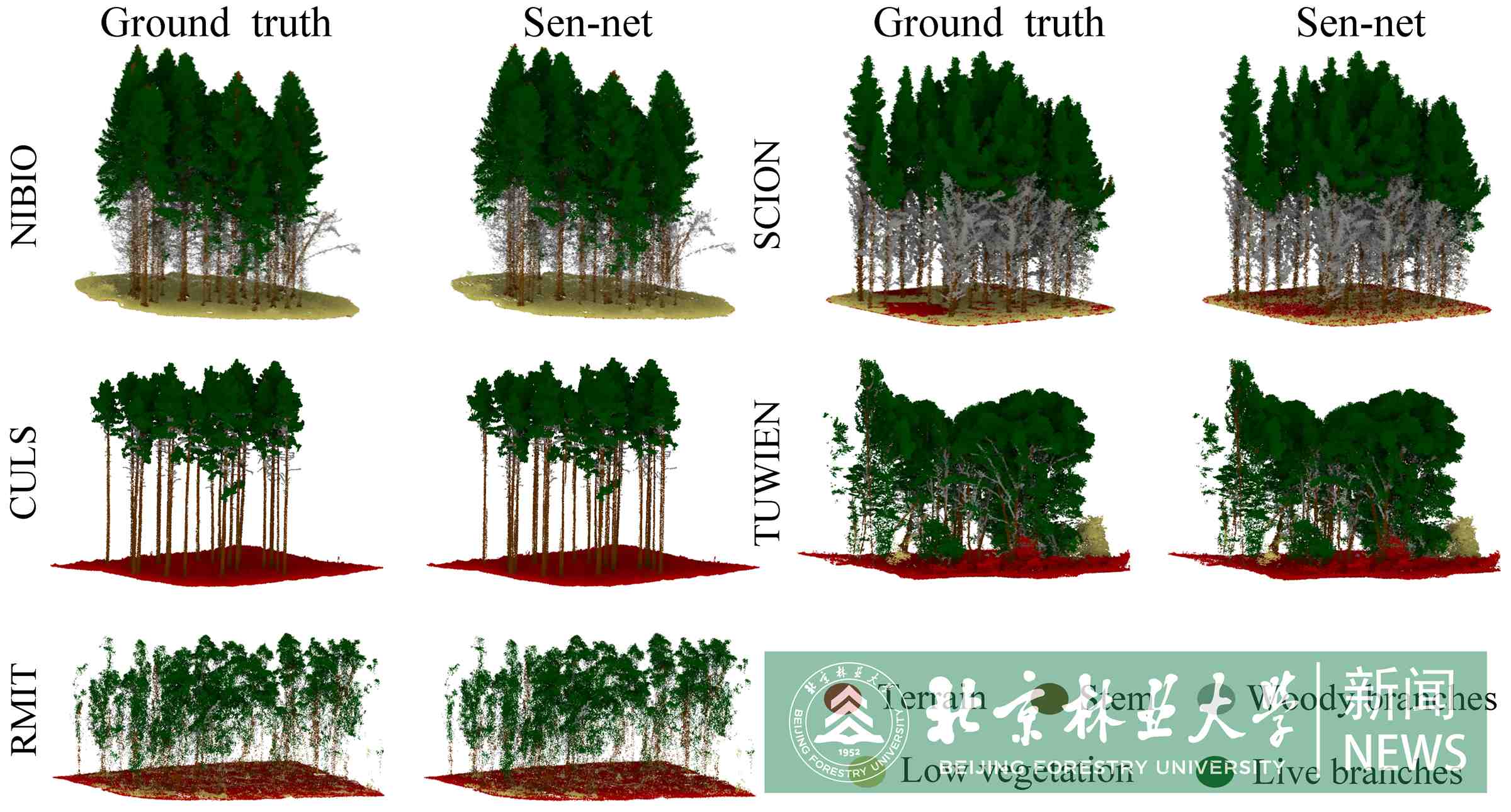 在Lin3D數(shù)據(jù)集上,Sen-net總體正確率、平均交并比分別達(dá)到97.6%和85.1%;在國際公開數(shù)據(jù)集上,總體正確率、平均交并比分別達(dá)到94.5%和78.2%,說明Sen-net在準(zhǔn)確性和泛化能力方面表現(xiàn)出色,優(yōu)于同類方法。該網(wǎng)絡(luò)無需調(diào)節(jié)參數(shù),使用方便,泛化能力強(qiáng),適用于森林場(chǎng)景點(diǎn)云分析,并可作為森林場(chǎng)景點(diǎn)云處理算法的基礎(chǔ)性框架,該研究成果表明團(tuán)隊(duì)在這一領(lǐng)域的研究處于國際前沿水平。
