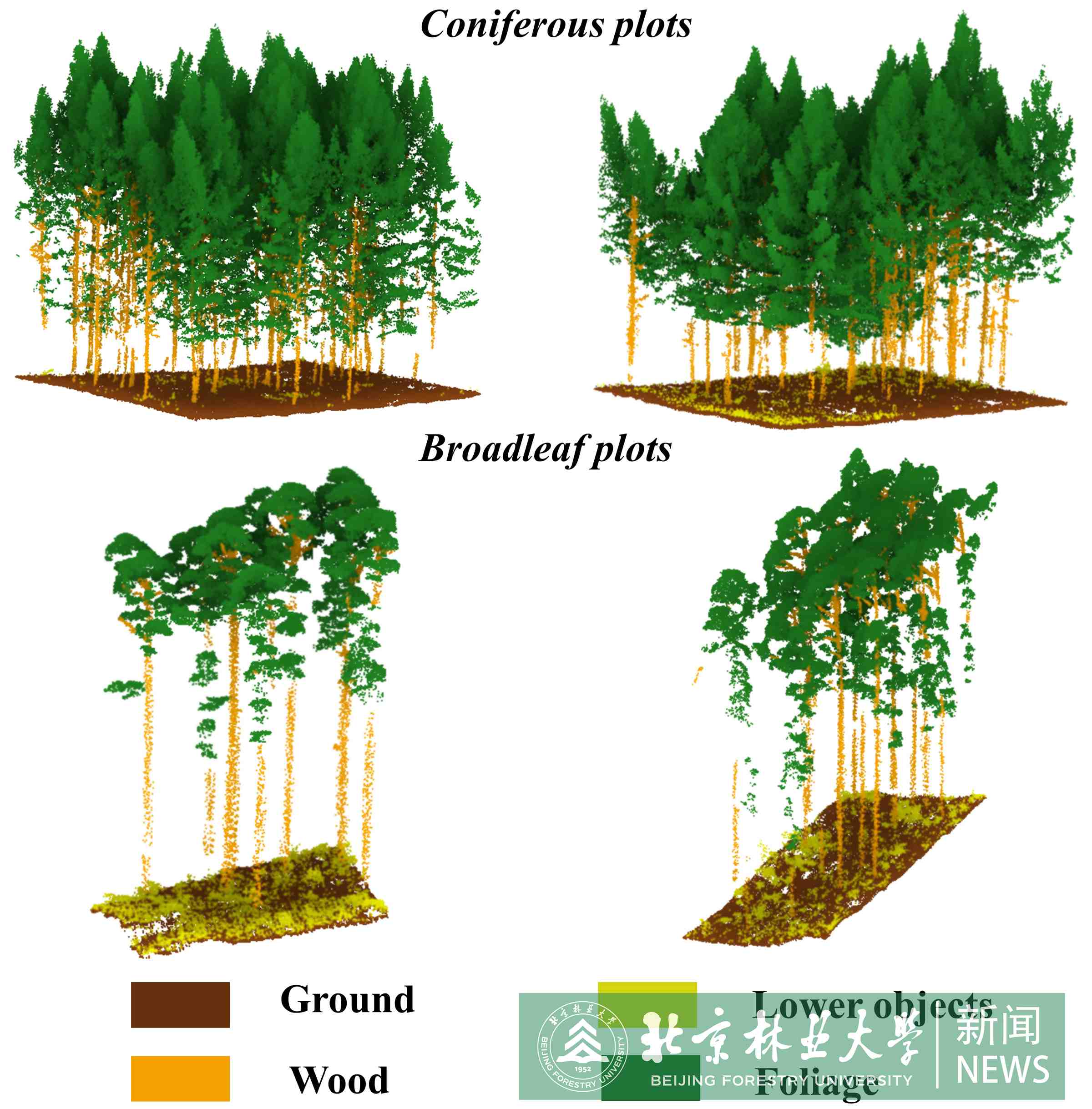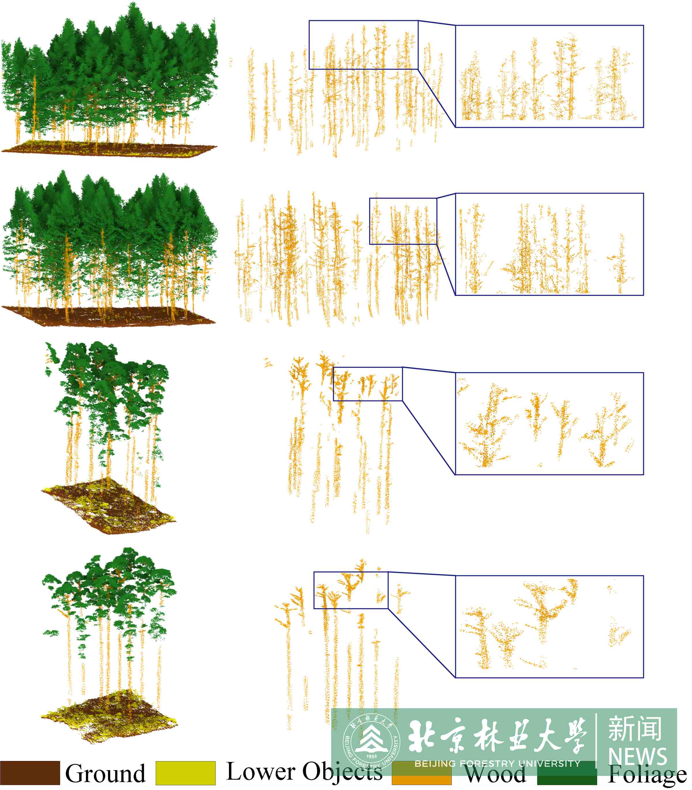 團(tuán)隊(duì)基于長期在三維點(diǎn)云處理方面的研究,充分發(fā)揮“遙感—林草—AI”學(xué)科交叉融合的優(yōu)勢(shì),發(fā)展了數(shù)據(jù)驅(qū)動(dòng)的深度神經(jīng)網(wǎng)絡(luò)模型,從森林場(chǎng)景三維點(diǎn)云有效分離出樹葉、木質(zhì)成分、低矮植被及地面。針對(duì)這一目標(biāo):