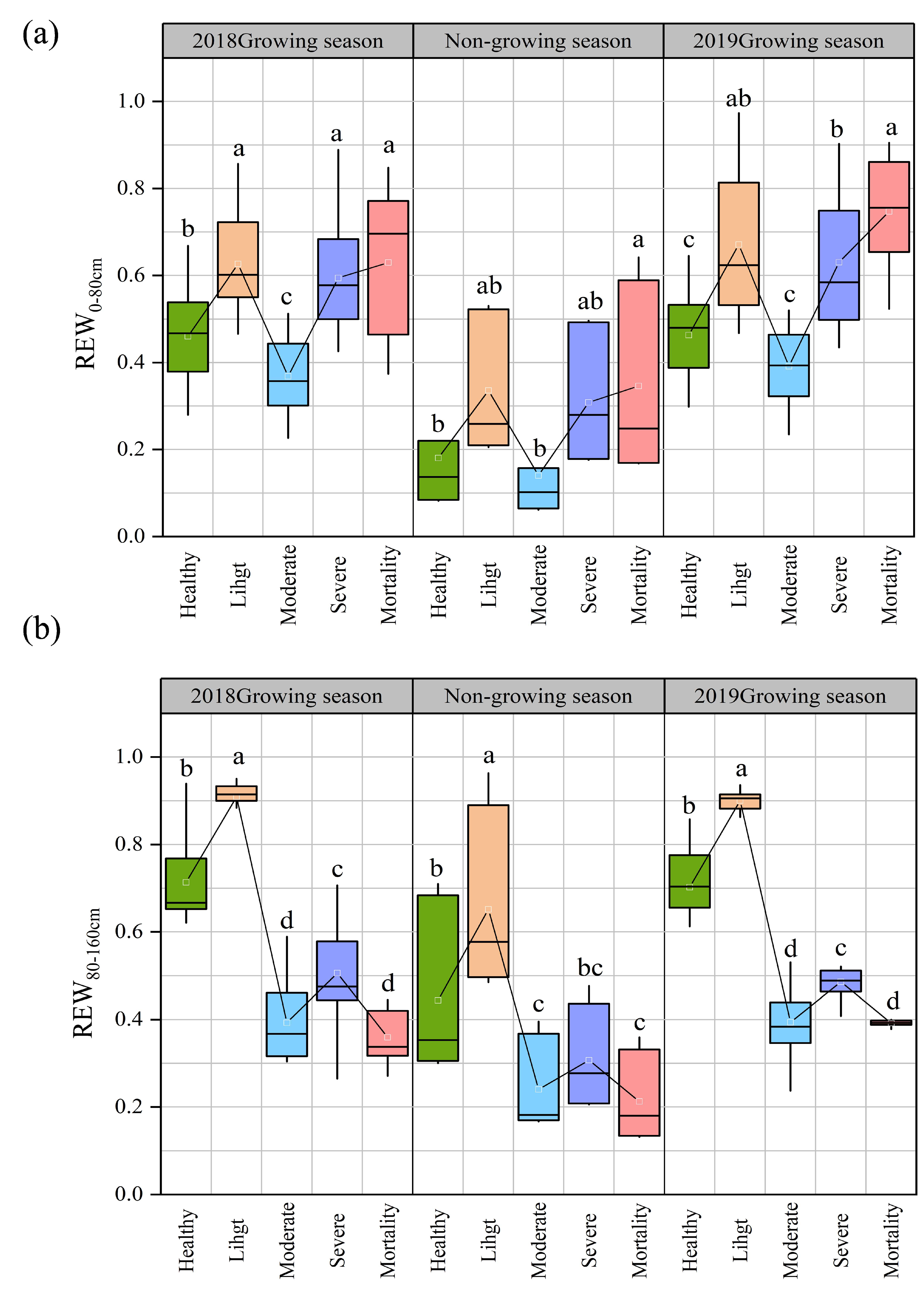 研究建議,在小葉楊人工林中度退化發生前應盡快采取有效管理措施,避免土壤水分虧缺和干土層的形成。解決和緩解土壤水分枯竭的最佳方法是對中度退化小葉楊人工林進行間伐,這將最大限度地減少土壤干燥以維持森林的長期可持續性。對于嚴重退化和死亡小葉楊人工林,淺層土壤水分恢復程度更高,表明退化小葉楊人工林需要更多的水分和時間來恢復原始土壤水分狀態。未來,全球氣候變化可能進一步加劇半干旱地區干旱風險,林分更新時應種植更耐旱樹種。