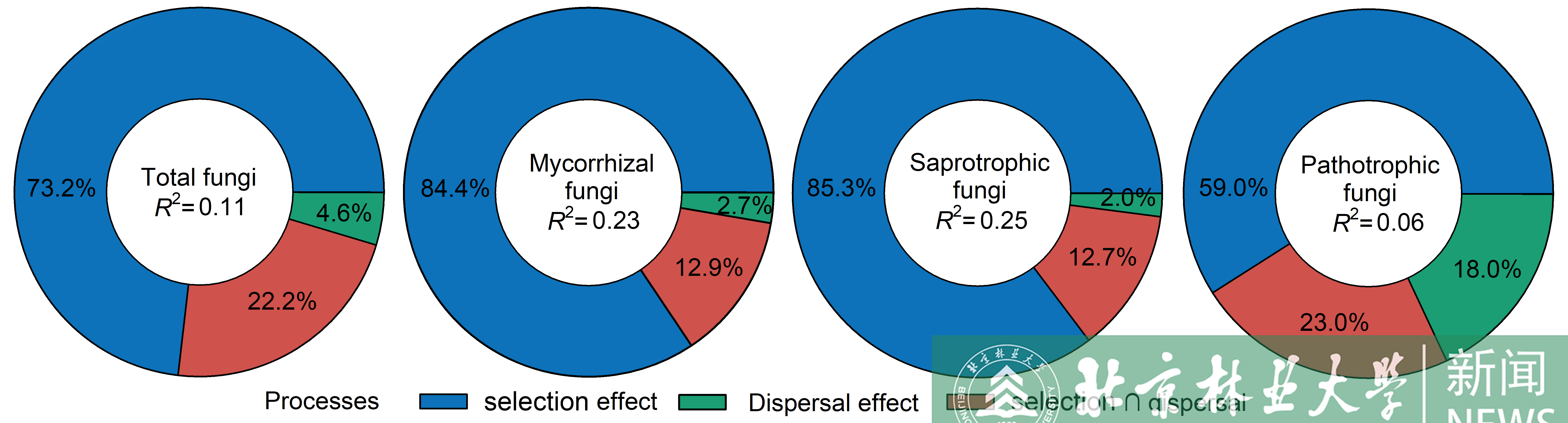 課題組還從地下維度厘清植物功能性狀對(duì)土壤真菌功能群構(gòu)建的影響,發(fā)現(xiàn)真菌群落及其功能群的構(gòu)建過(guò)程由確定性過(guò)程(異質(zhì)性選擇)驅(qū)動(dòng),植物根系性狀是介導(dǎo)真菌群落構(gòu)建的主要因素。