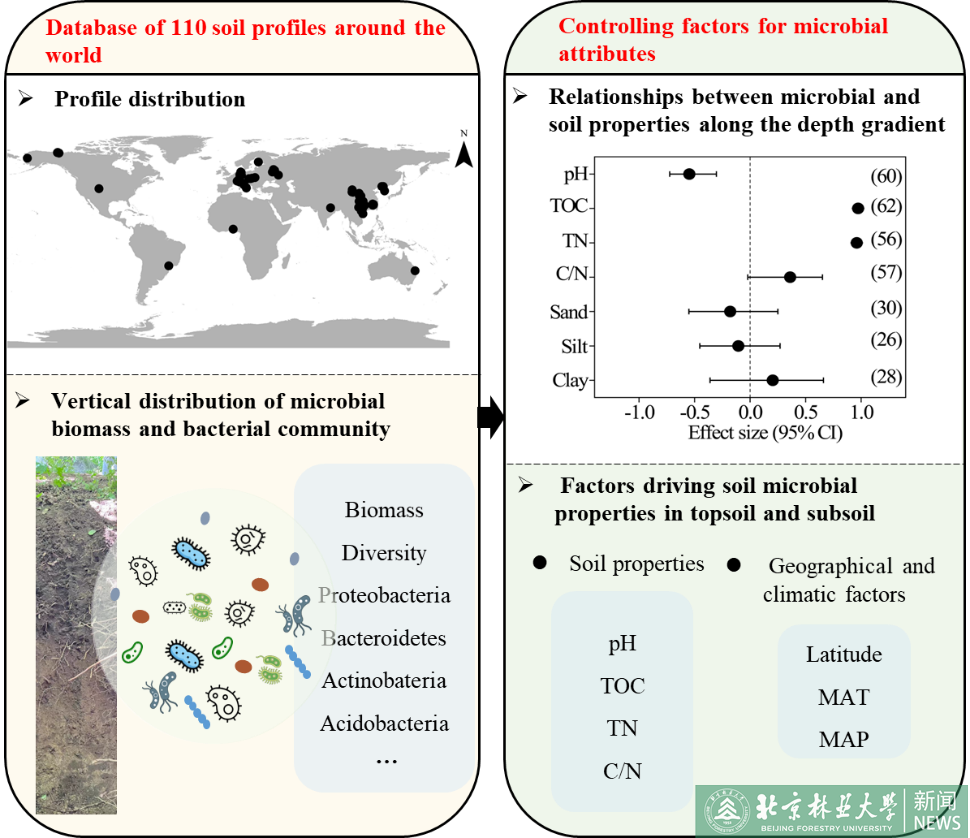 近日,林學院森林土壤學團隊基于全球110個土壤剖面數據的研究揭示了微生物生物量和細菌群落隨土壤深度的垂直分布特征,并闡明了微生物生物量和多樣性的全球分布格局的驅動因素,研究成果發表在Science of The Total Environment(一區,IF=10.753)上,論文題為The vertical distribution and control factor of microbial biomass and bacterial community at macroecological scales,博士生何麗兵為第一作者,孫向陽教授為通訊作者,北京林業大學為文章唯一完成單位。