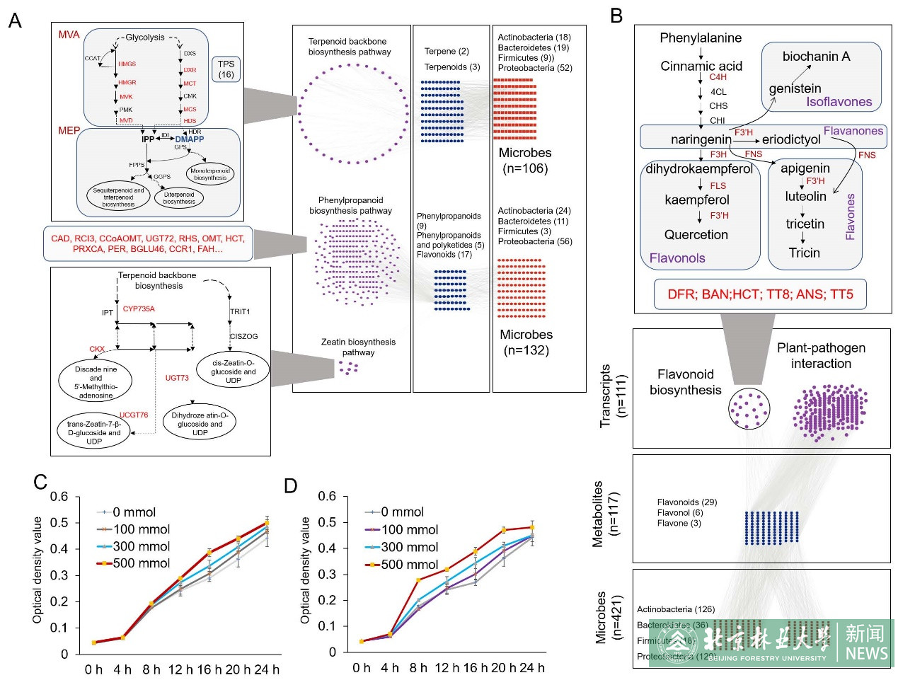 該研究發現,放線菌的豐度隨樹齡的增加與黃酮類化合物的生物合成密切相關,并通過分子遺傳學方法揭示了類黃酮類生物合成調節基因Transparent Testa 8(TT8)與類黃酮相關放線菌的募集有關。放線菌分離株的接種實驗表明,其定殖可以顯著改善宿主的表型。定點誘變表明,鏈霉菌分離株bj1中參與氨基環醇潮霉素B類似物的生物合成的hyBl基因簇與疾病抑制有關。在此基礎上,科研人員認為多年生植物和土壤微生物之間的相互作用導致了特定微生物群落的富集,這些微生物可能含有大量目前未知的功能特征。