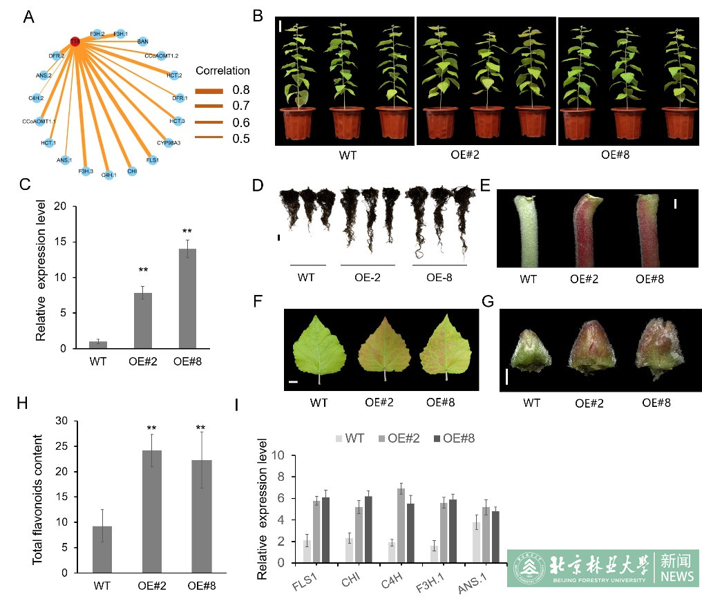 為了進一步研究基因表達和黃酮類物質積累對放線菌豐度的影響,作者對類黃酮生物合成途徑的共表達模塊進行了詳細的分析。在這一共調控網絡中發現了多個轉錄因子,包括WRKY26和WRKY33,它們可能導致一些植物防御相關基因的激活。在構建的協同調節網絡中, Transparent Testa 8(TT8)編碼一個螺旋-環-螺旋結構域蛋白,與脅迫響應、黃素內醇和茉莉酸生物合成以及類黃酮生物合成有關。TT8的表達量在楊樹發育過程中持續增加,并在35年的樹中達到峰值。TT8與類黃酮生物合成途徑基因的表達模式高度相關。進一步的研究表明,與類黃酮途徑相關的幾個關鍵酶和代謝物被聚集在一起。這些數據表明,TT8可能是參與類黃酮途徑的關鍵調控因子,有可能調節放線菌的豐度。為了研究TT8在楊樹根系放線菌招募中的作用,作者進行了16S rRNA基因擴增測序,對野生型和過表達TT8的轉基因株系的根系微生物區系進行了分析。研究發現,過表達TT8的轉基因株系與富含黃酮類化合物的asv的相對豐度相關,表明TT8有助于楊樹放線菌的招募和選擇。