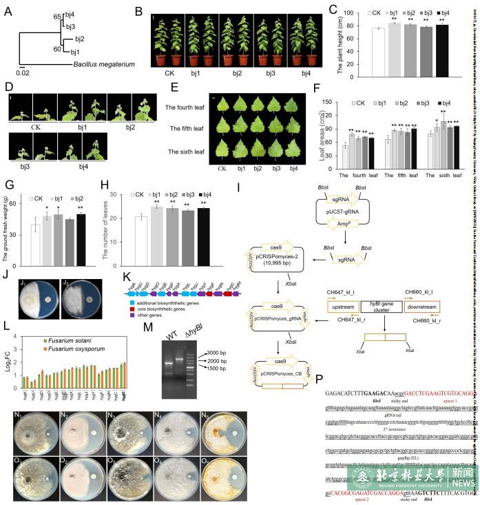 結果表明,根內放線菌的相對豐度隨著樹齡的增加而增加,這種增加可能有助于植物的健康。作者認為放線菌豐度的增加可能是由于特定的優勢譜系的增加,如鏈霉菌。為了進一步研究放線菌改變宿主表型的潛力,作者對來自組織培養的楊樹植株進行了鏈霉菌接種實驗。結果表明,與對照植株相比,接種的植株具有更大的葉面積、更高的株高。選取鏈霉菌bj1進一步對基因組序列進行功能分析,基因組注釋顯示了28個次級代謝產物基因簇,與非核糖體肽、多酮、萜烯、鐵載體、核糖體合成肽和翻譯后修飾肽的生物合成相關。