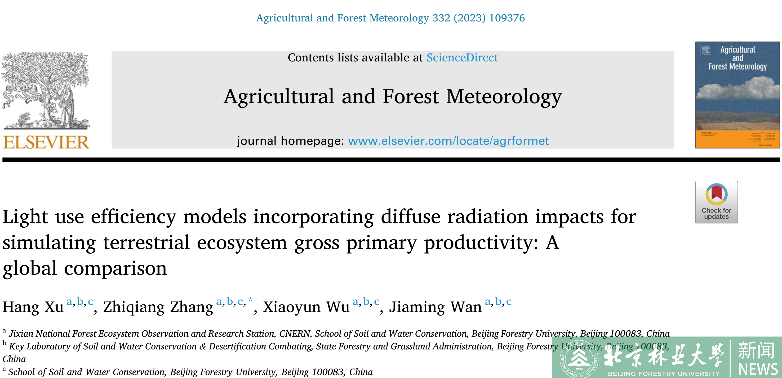 近日,農林科學領域頂級期刊Agricultural and Forest Meteorology在線發表了我校水保學院張志強教授團隊學術論文“Light use efficiency models incorporating diffuse radiation impacts for simulating terrestrial ecosystem gross primary productivity: A global comparison”,水保學院青年教師許行博士為該論文第一作者,張志強教授為通訊作者。