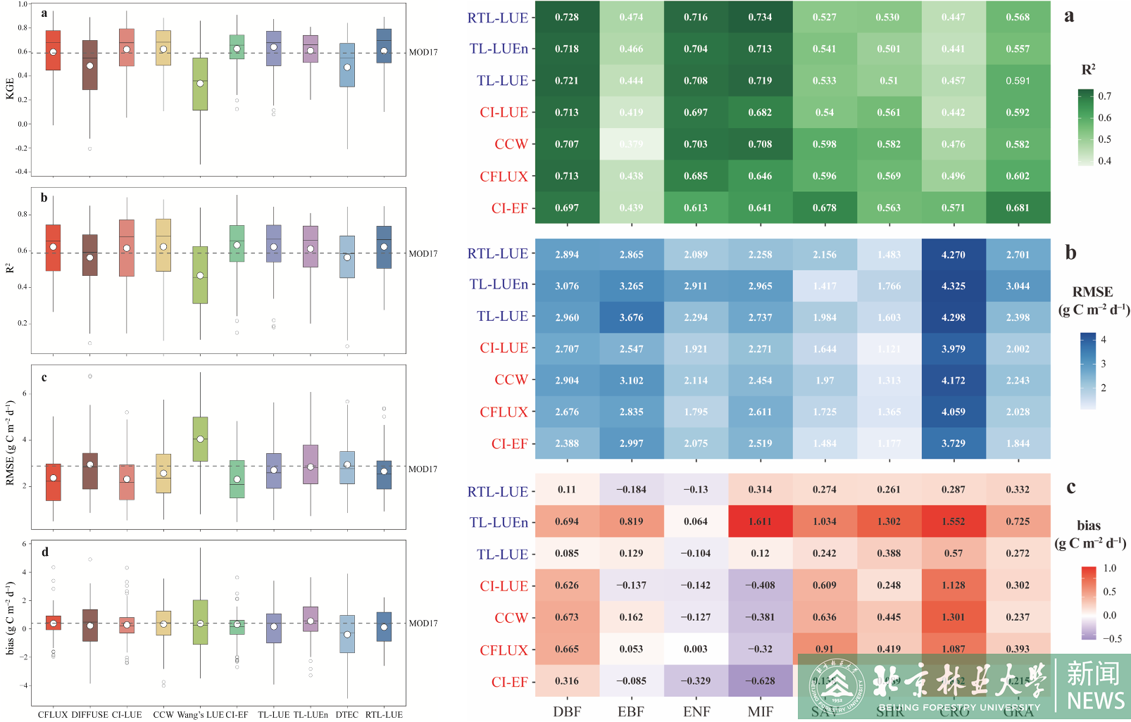 針對上述問題,研究團隊利用全球102個陸地生態系統和950個站點年的碳通量、氣象、植被等多源數據,對目前廣泛使用的十個LUE模型(CFLUX、DIFFUSE、CI-LUE、Wang's Model、CI-EF、TL-LUE、TL-LUEn、DTEC和RTL-LUE)的模擬結果進行了全球評估。