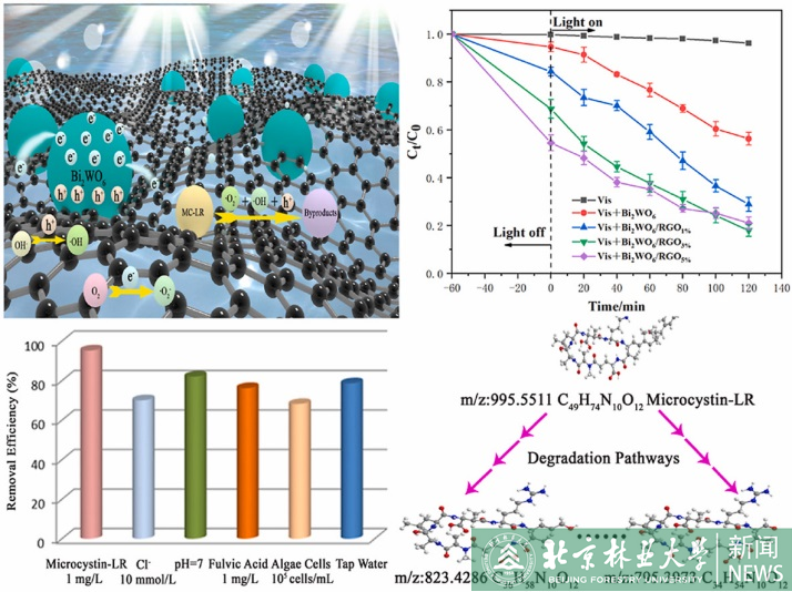 環境學院洪喻教授課題組完成的利用鎢酸鉍還原氧化石墨烯異質結可見光下降解微囊藻毒素LR的研究成果“Visible light-driven photocatalytic degradation of Microcystin-LR by Bi2WO6/Reduced graphene oxide heterojunctions: Mechanistic insight, DFT calculation and degradation pathways”發表在環境類Top期刊《Chemosphere》(IF=8.943)上,第一作者為環境學院博士研究生戰明明,北京林業大學為第一完成單位。