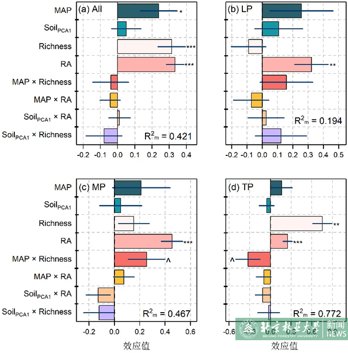 圖3(a.b.c.d) 生物(物種豐富度、繁殖分配)和環(huán)境因子(年降水、土壤綜合指標(biāo))對(duì)物種空間隔離指數(shù)(Mscom)的獨(dú)立和交互效應(yīng)。RA:繁殖分配;SoilPCA1:土壤綜合指標(biāo)。