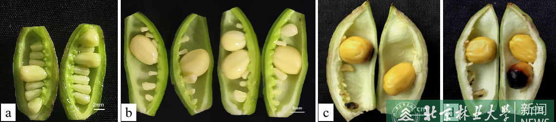 大花黃牡丹(Paeonia ludlowii (Stern & G. Taylor) D.Y. Hong)屬芍藥科芍藥屬牡丹組,是我國特有的國家重點保護植物。其株形高大,花黃色(圖1),觀賞、育種、藥用和經濟價值高。大花黃牡丹在野外僅依靠種子繁殖,種子敗育是制約其野生種群擴大制約因素之一(圖2),但迄今對其敗育機制知之甚少。論文在形態學觀察基礎上,采用高通量測序技術進行轉錄組測序,挖掘與胚珠/種子發育及敗育相關基因。