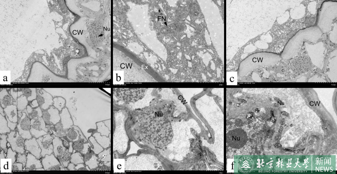 大花黃牡丹自然授粉15天后,外部形態差異顯著的種子其超微結構也存在明顯差異。正常胚珠中胚乳游離核結構完整,可清晰分辨出核仁、染色質結構,游離核周圍分布大量細胞質,細胞壁外有大量分泌物,多數線粒體沿細胞壁分布;而在同期的敗育胚珠中,胚乳游離核及細胞質均已退化,僅殘存一些痕跡,質膜皺縮,細胞壁較正常胚珠薄,染色更深,細胞壁外幾乎觀察不到分泌物,部分細胞核內染色質趨于邊緣化,表現出程序性死亡(PCD)的特征,推測大花黃牡丹胚珠提前啟動了PCD,而過早的PCD可能是導致其早期胚珠敗育的原因之一(圖3)。