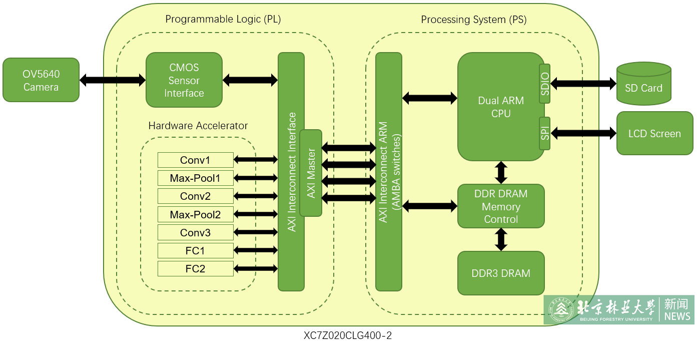 該工作以題為“FPGA–accelerated CNN for real-time plant disease identification”的論文發表,為在農田環境對邊緣終端設備的成本、性能、供電方式和便攜性都有極大限制的情況下,實現植物病害實時準確識別,提供了應用案例,也為農業類似場景(采用人工智能方法對視頻數據進行現場快速信息提取),提供了參考解決方案。論文第一作者為課題組研究生羅鑰軒,通訊作者為蔡祥,第一完成單位為北京林業大學,研究工作得到了國家自然科學基金(項目編號:31400621)資助。