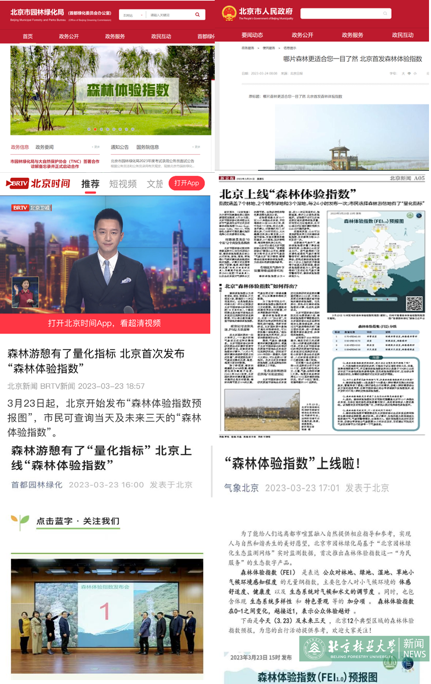 “森林體驗指數”的提出打通了科研成果轉化的“最后一公里”,將大量枯燥的科研數據轉化為公眾容易理解的生態數據產品,拉近了人與自然的距離,也拉近了科研、行業與公眾的距離。“森林體驗指數”數據產品發布后,得到了北京人民政府網“首都之窗”、光明網、北京衛視、北京日報、新京報等多家媒體的高度關注和深度報道。報道認為,“森林體驗指數”不僅是學習貫徹黨的二十大精神和“綠水青山就是金山銀山”理念的生動實踐,也充分體現了新時代數字中國建設的發展趨勢。同時,“森林體驗指數”也打開了社會公眾與自然對話的窗口,為社會公眾出游目的地選擇提供了重要的量化依據,豐富了園林綠化行業服務公眾的內容,為民生福祉“加碼”。