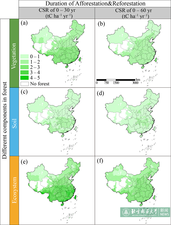 此外,研究還生產了造林區劃圖(圖3)和一套計算造林/再造林碳匯的關鍵參數(單位面積、單位年的固碳速率,tC ha–1 yr–1),可以快速計算不同尺度(省、市、縣)造林/再造林后森林生態系統不同組分的固碳潛力。旨在通過優化后的造林/再造林固碳速率分布圖和關鍵參數為中國造林/再造林規劃提供參考,為區域碳貿易和碳補償提供依據(圖4)。