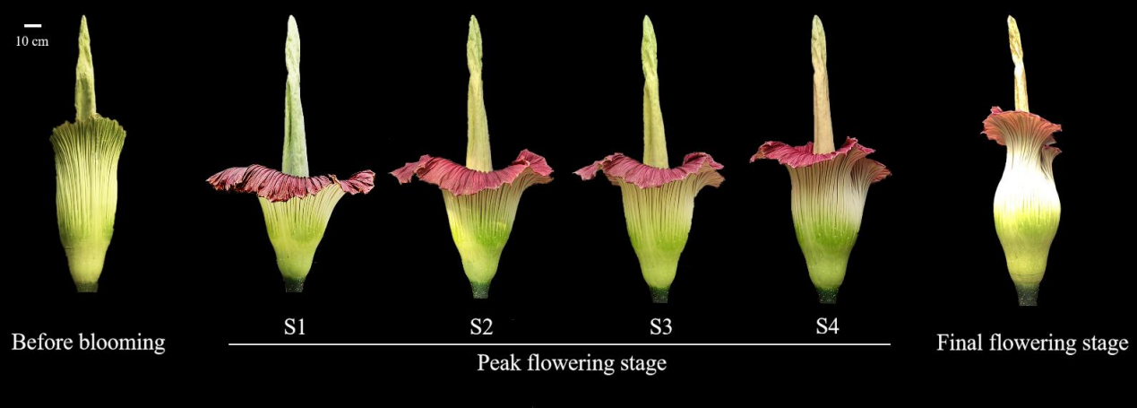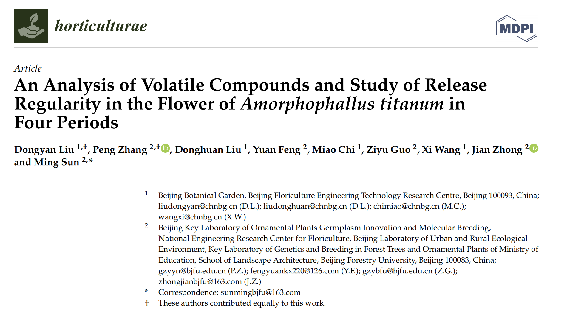 近期,我校園林學院孫明教授課題組聯合國家植物園在國際期刊《Horticulturae》上發表了關于巨魔芋開花氣味成分研究的文章“An Analysis of Volatile Compounds and Study of Release Regularity in the Flower of Amorphophallus titanum in Four Periods”(《巨魔芋4個時期花朵揮發性成分分析及釋放規律研究》),首次探究了巨魔芋花朵4個時期的氣味成分含量以及變化規律,揭示了巨魔芋“另類花香”的真實面目 。