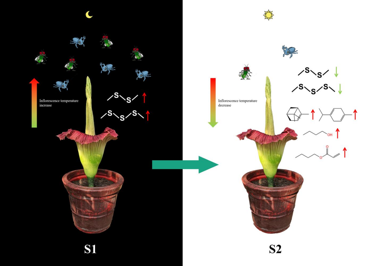 巨魔芋揮發性成分和花序溫度對昆蟲吸引力的影響示意圖
