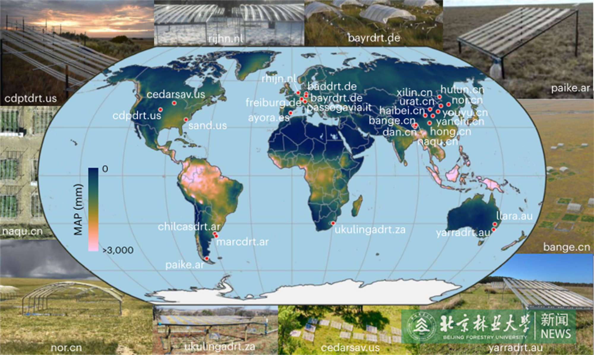 該研究基于NPK-Drought Network (https://www.bayceer.uni-bayreuth.de/npkd/index.php?lang=en),使用了全球9個國家26個地點的實驗數據(圖1),系統評估了干旱和養分添加及其交互作用對草原生態系統生產力的影響。