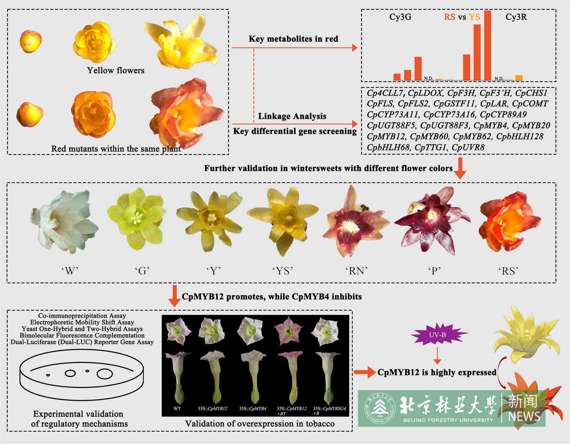 研究系統(tǒng)性揭示了色素代謝與基因表達(dá)之間的復(fù)雜映射關(guān)系:CpMYB12作為激活因子,通過與CpbHLH128和CpTTG1組建復(fù)合體,直接促進(jìn)CHS、F3H、FLS與LDOX等關(guān)鍵基因的轉(zhuǎn)錄,從而驅(qū)動花色苷積累;而CpMYB4則作為拮抗因子,對同一通路實施抑制。進(jìn)一步的跨物種功能驗證與UV-B誘導(dǎo)實驗表明,環(huán)境信號能夠通過調(diào)控CpMYB12的表達(dá)水平,觸發(fā)色素合成與花色加深。這一發(fā)現(xiàn)不僅闡明了蠟梅“由黃轉(zhuǎn)紅”的分子邏輯,也為觀賞植物花色改良與環(huán)境適應(yīng)性研究提供了全新思路。