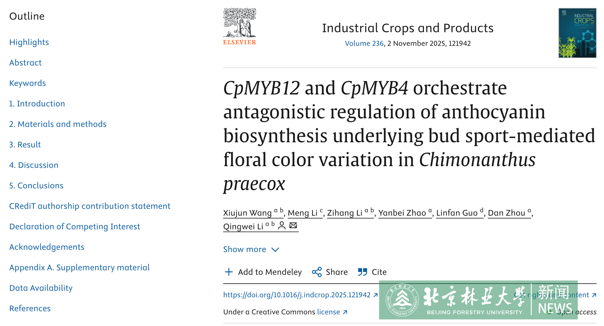 近日,園林學(xué)院李慶衛(wèi)教授科研團(tuán)隊在闡述蠟梅花色變化領(lǐng)域取得重要進(jìn)展。研究成果以“CpMYB12 and CpMYB4 orchestrate antagonistic regulation of anthocyanin biosynthesis underlying bud sport-mediated floral color variation in Chimonanthus praecox”為題,在線發(fā)表于中國科學(xué)院一區(qū)TOP期刊Industrial Crops and Products。
