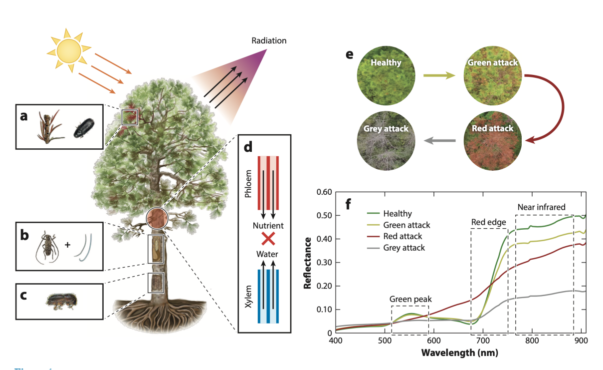 林木鉆蛀性害蟲危害隱蔽、癥狀滯后,常規手段發現時往往已連片成災,但遙感技術具有實現林木鉆蛀性害蟲早期監測的潛力與可能。北京林業大學駱有慶教授研究團隊的論文“Early Monitoring of Forest Wood-Boring Pests with Remote Sensing”,近期已在昆蟲學國際頂級期刊《Annual Review of Entomology》(IF="22.682)上在線發表。
