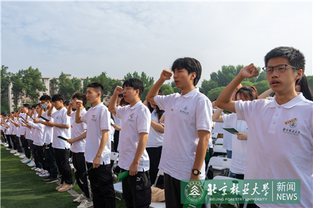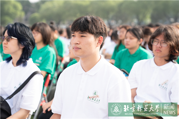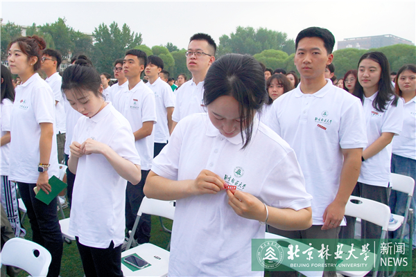校領導為新生代表佩戴校徽。全體新生起立,集體佩戴校徽。校徽是我校的標識,更是一種傳承和責任。戴上校徽的這一刻,他們成為了北京林業大學的一份子。