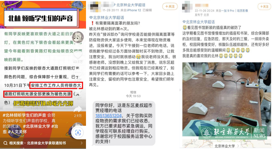 “努力傾聽(tīng)學(xué)生聲音的北林,愛(ài)了!”在學(xué)校官微后臺(tái),每天都能收到來(lái)自學(xué)生熱情洋溢的留言,而在抖音平臺(tái)上,我校接訴即辦的暖心舉措收獲了40余萬(wàn)網(wǎng)友點(diǎn)贊,近2萬(wàn)條留言。
