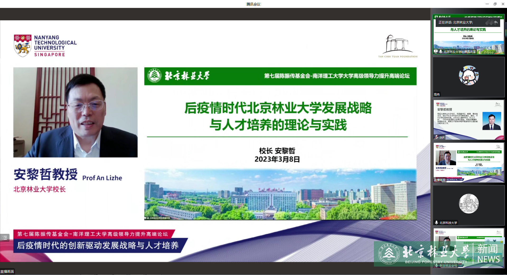 3月8日,第七屆陳振傳基金會-南洋理工大學(xué)高級領(lǐng)導(dǎo)力提升高端論壇在新加坡舉辦。來自中新兩國10家高校、科研單位的領(lǐng)導(dǎo)、專家和師生通過線上線下方式,圍繞“后疫情時代的創(chuàng)新驅(qū)動發(fā)展戰(zhàn)略與人才培養(yǎng)”主題充分交流研討。校長安黎哲在線作題為“后疫情時代北京林業(yè)大學(xué)發(fā)展戰(zhàn)略與人才培養(yǎng)的理論與實踐”的主旨報告。